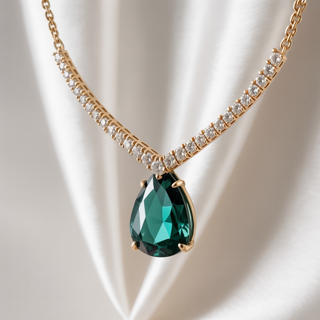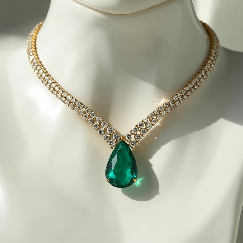 圧倒的な存在感を放つペアシェイプカットのエメラルドが、胸元で深いグリーンの輝きを放つラグジュアリーネックレス。