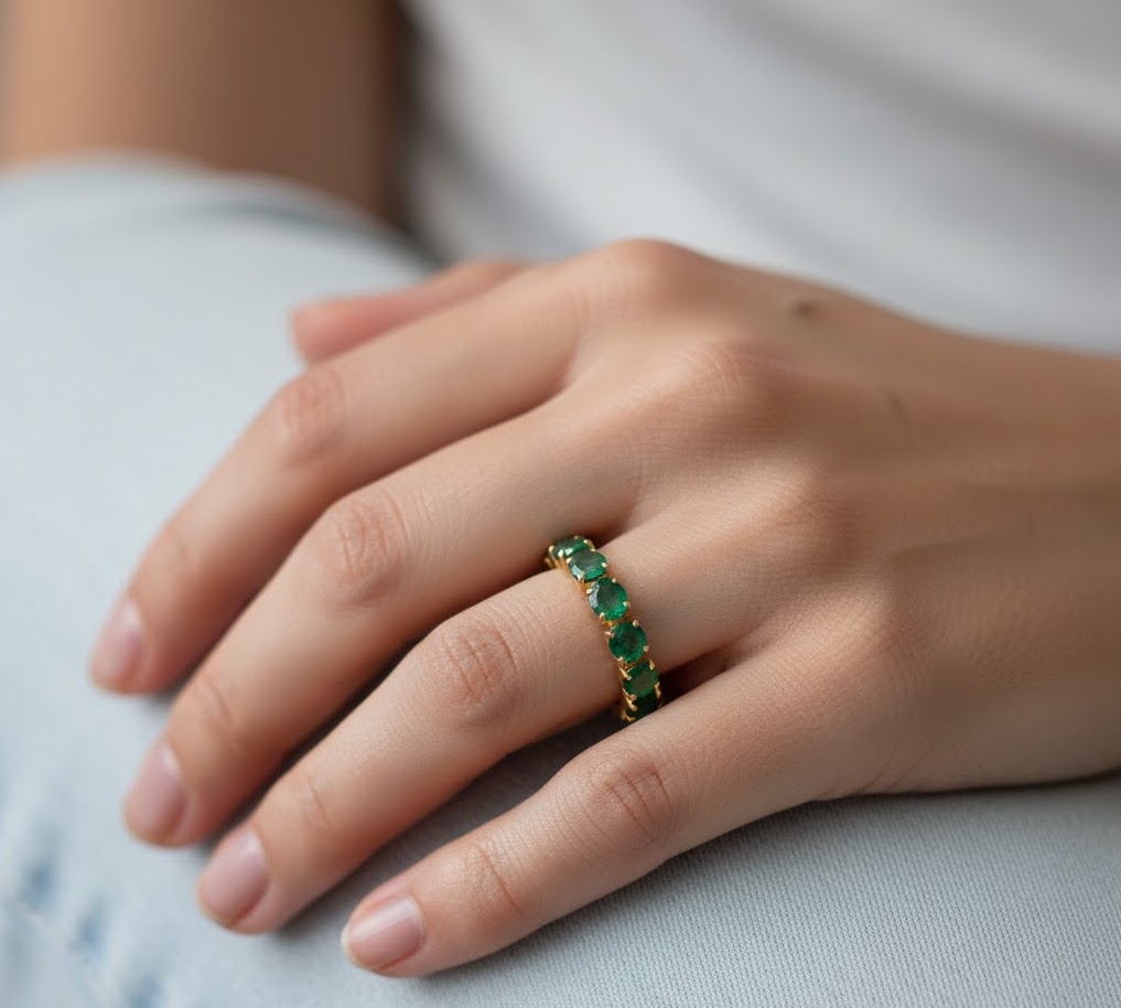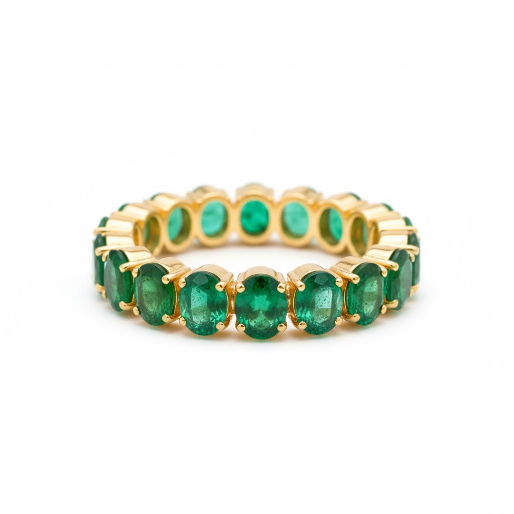 このエメラルド エタニティリングは、深いグリーンが魅力のエメラルドを贅沢にぐるりと一周に配置し、360度どこから見ても輝きを放つラグジュアリーなデザインです。