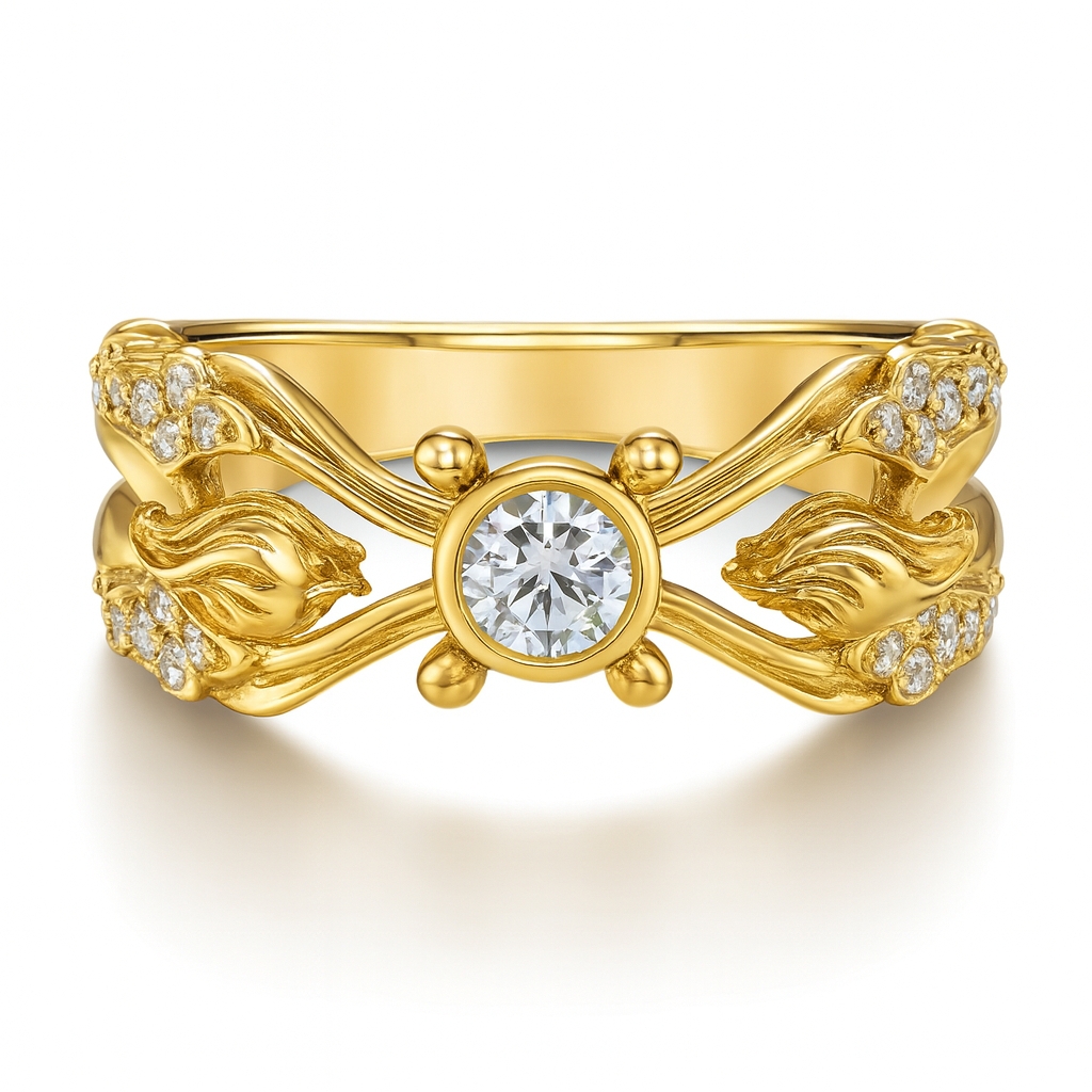 炎のように流れる立体的な造形と、中央に輝くダイヤモンドが特徴のアートリング。躍動感とラグジュアリーを兼ね備えた芸術的デザインです。