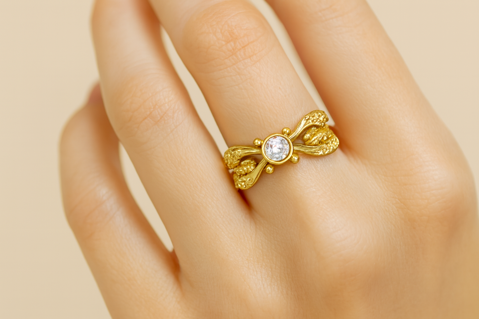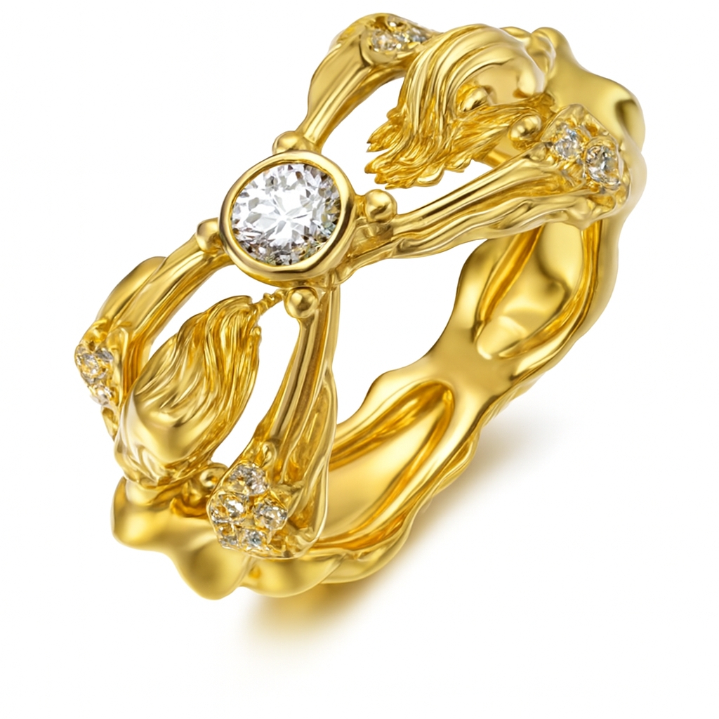 自然の力強さと流動的な美をテーマにした、彫刻的なK18イエローゴールドリング。