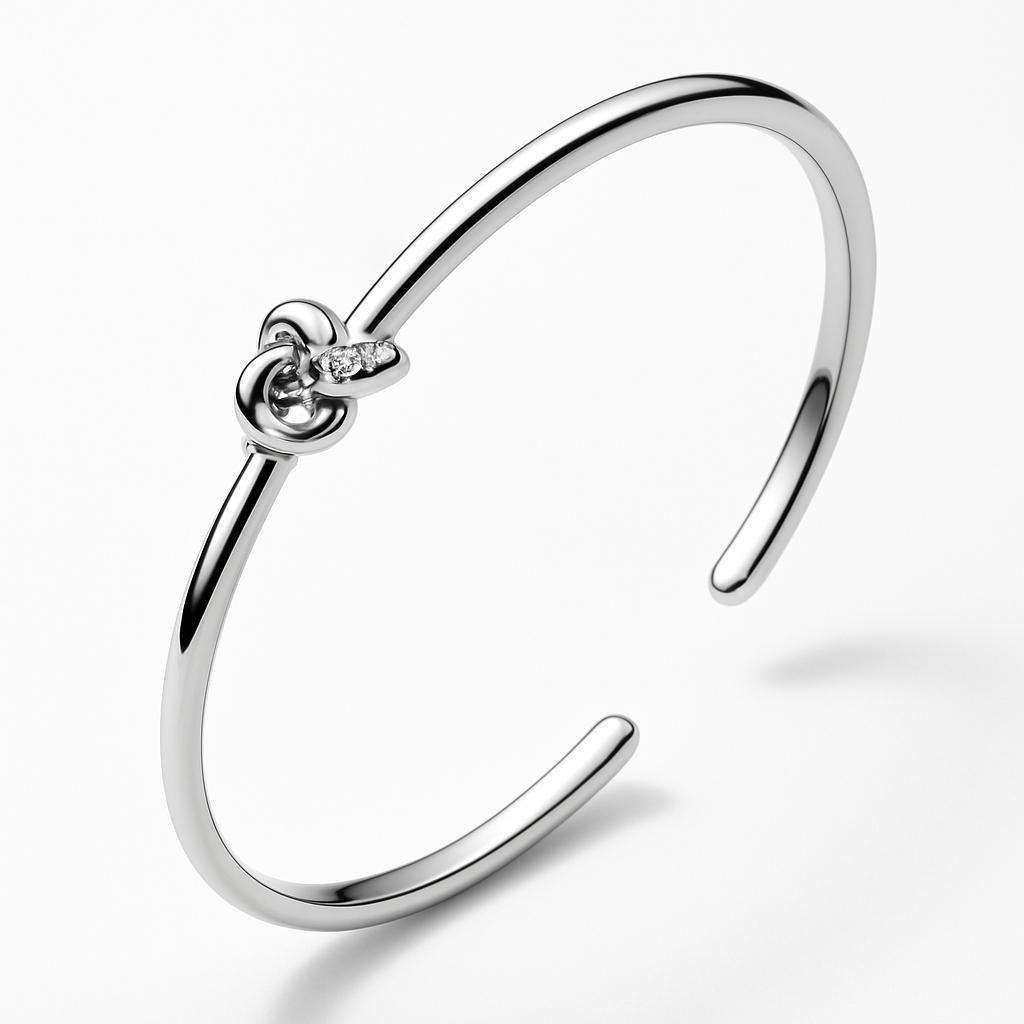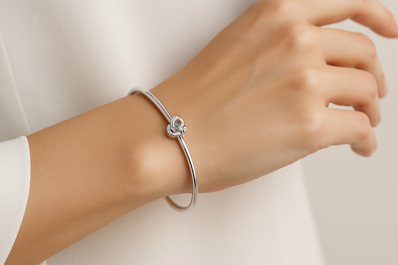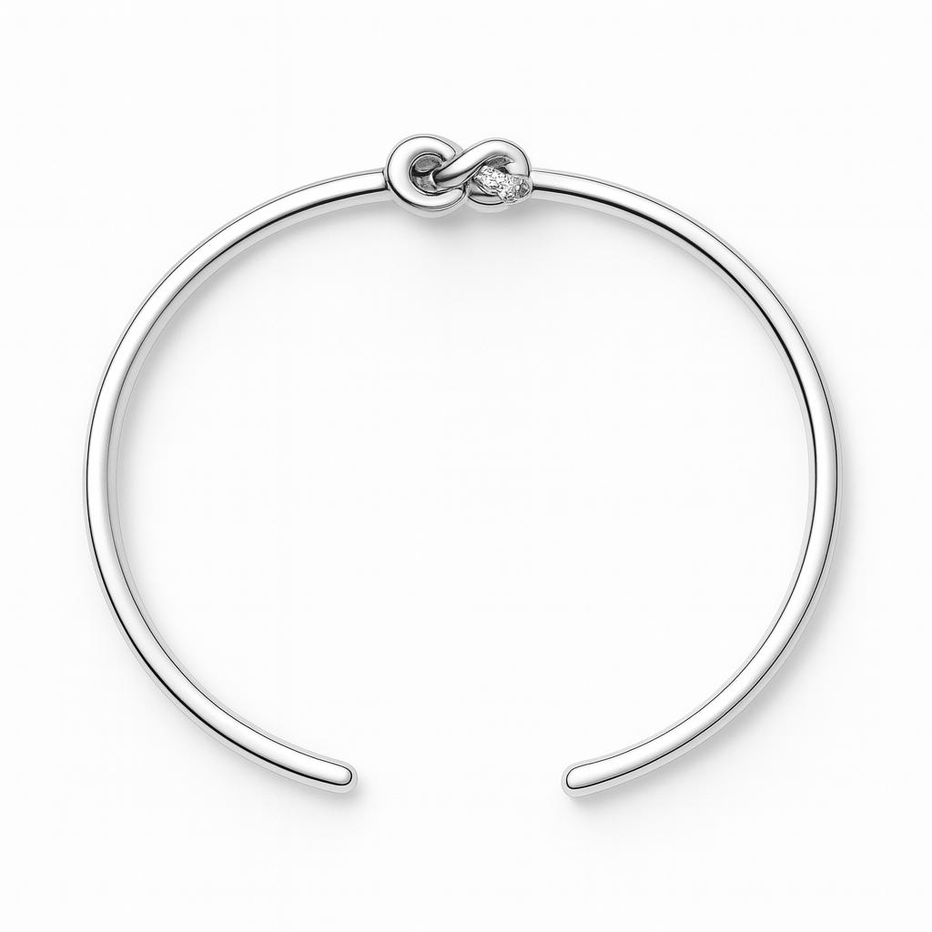 “結び”をモチーフにしたノットデザインが象徴的な、シルバー仕上げのオープンバングル。