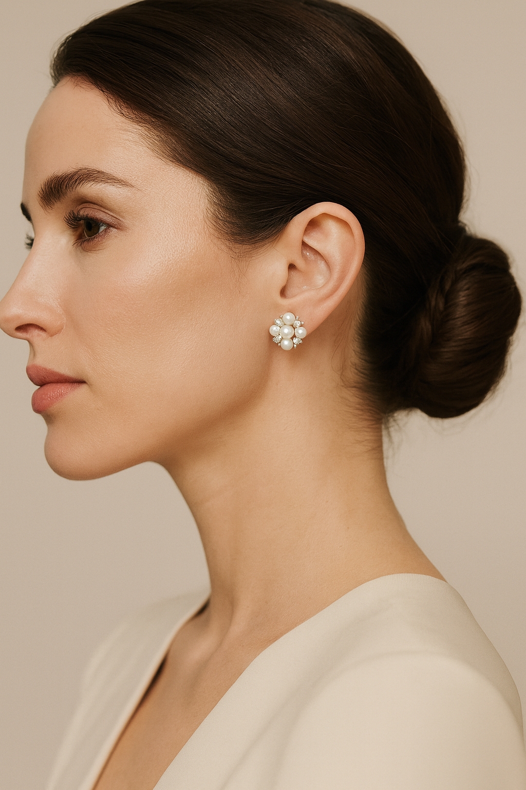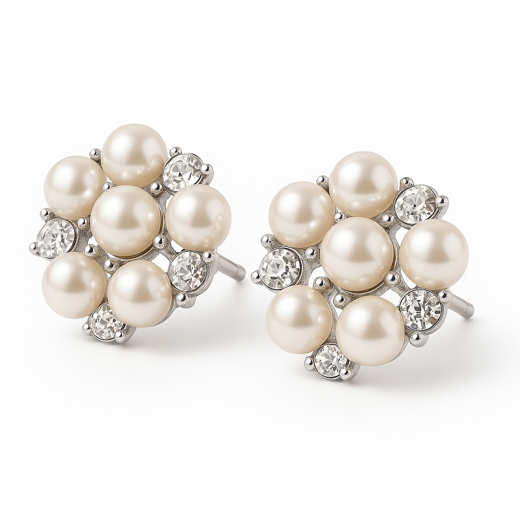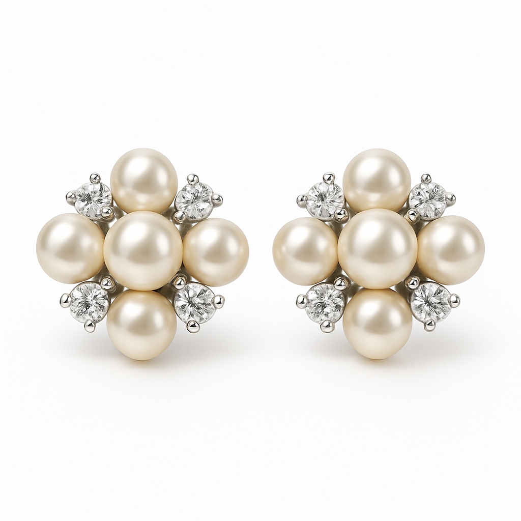 上品な輝きを放つパールとダイヤモンドが、繊細に組み合わされたフラワーデザインのスタッドピアス。