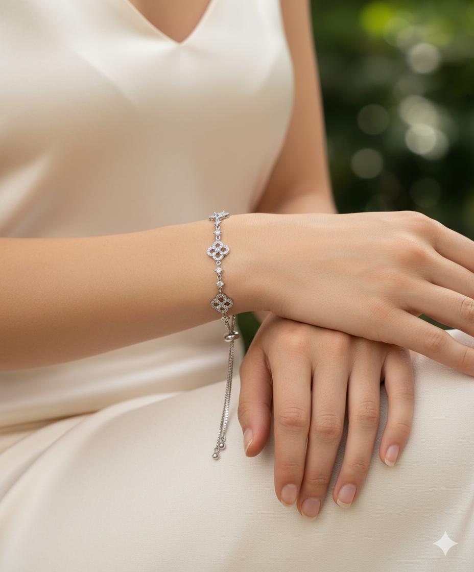 細部まで丁寧に仕上げられたデザインは、動くたびにきらめきを放ち、手元に上質な存在感を添えます。スライド式の調整パーツにより、簡単に長さを変えられ、手首にぴったりフィット。