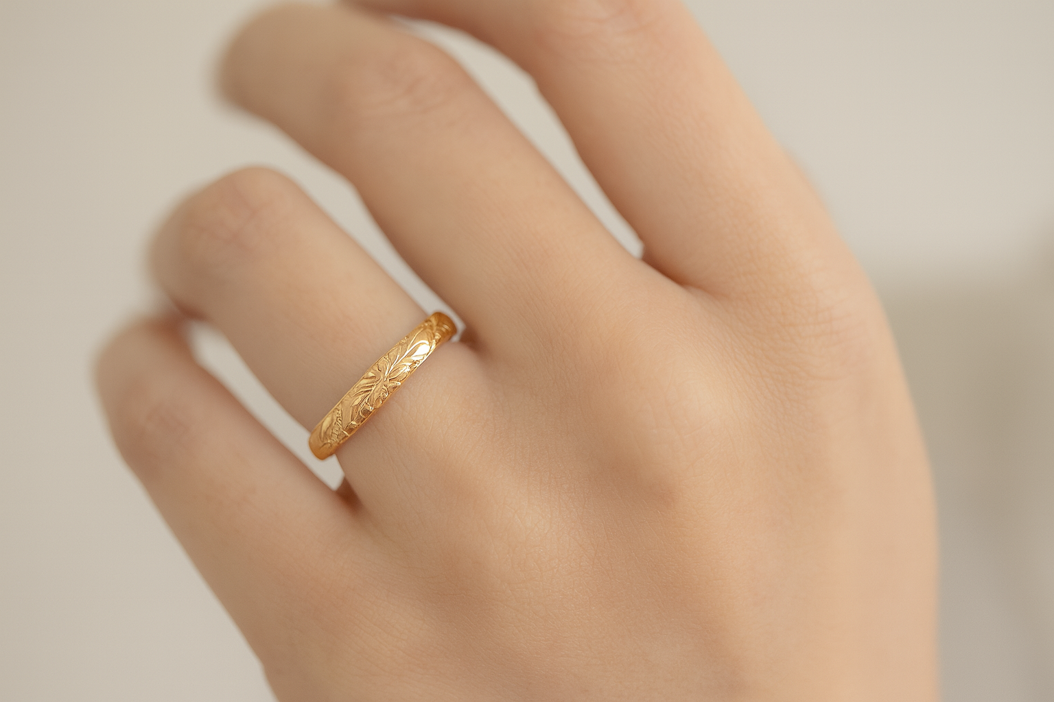 繊細なフローラル模様を立体的に彫り込んだ、気品あふれるゴールドリング。