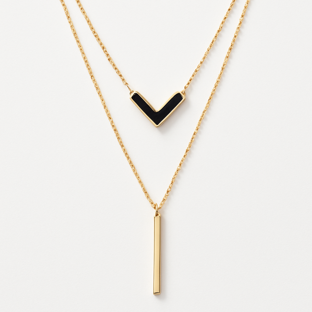 スタイリッシュな印象を放つ、ブラックオニキスとゴールドの2連ネックレス。
