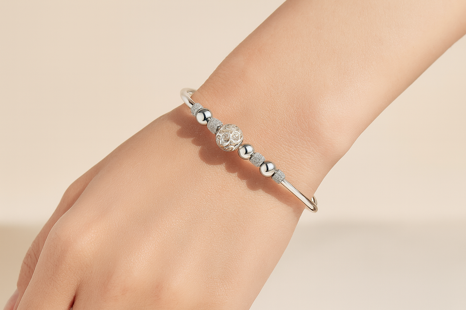中央には、優美な透かし彫り(フィリグリー)技法を用いた球体モチーフが配され、柔らかく流れるようなラインが手元に華やぎを添えます。ビーズ部分にはミラーポリッシュ仕上げとマイクロパヴェ加工が施され、光の加減によって多層的な輝きを放ちます。