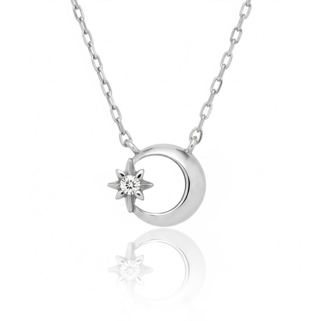 夜空をイメージした「月」と「星」を重ね合わせた、幻想的で洗練されたデザインのシルバーペンダントです。三日月の滑らかなラインと、中心で輝く八芒星が絶妙なバランスで配置され、首元に上品なアクセントを添えます。