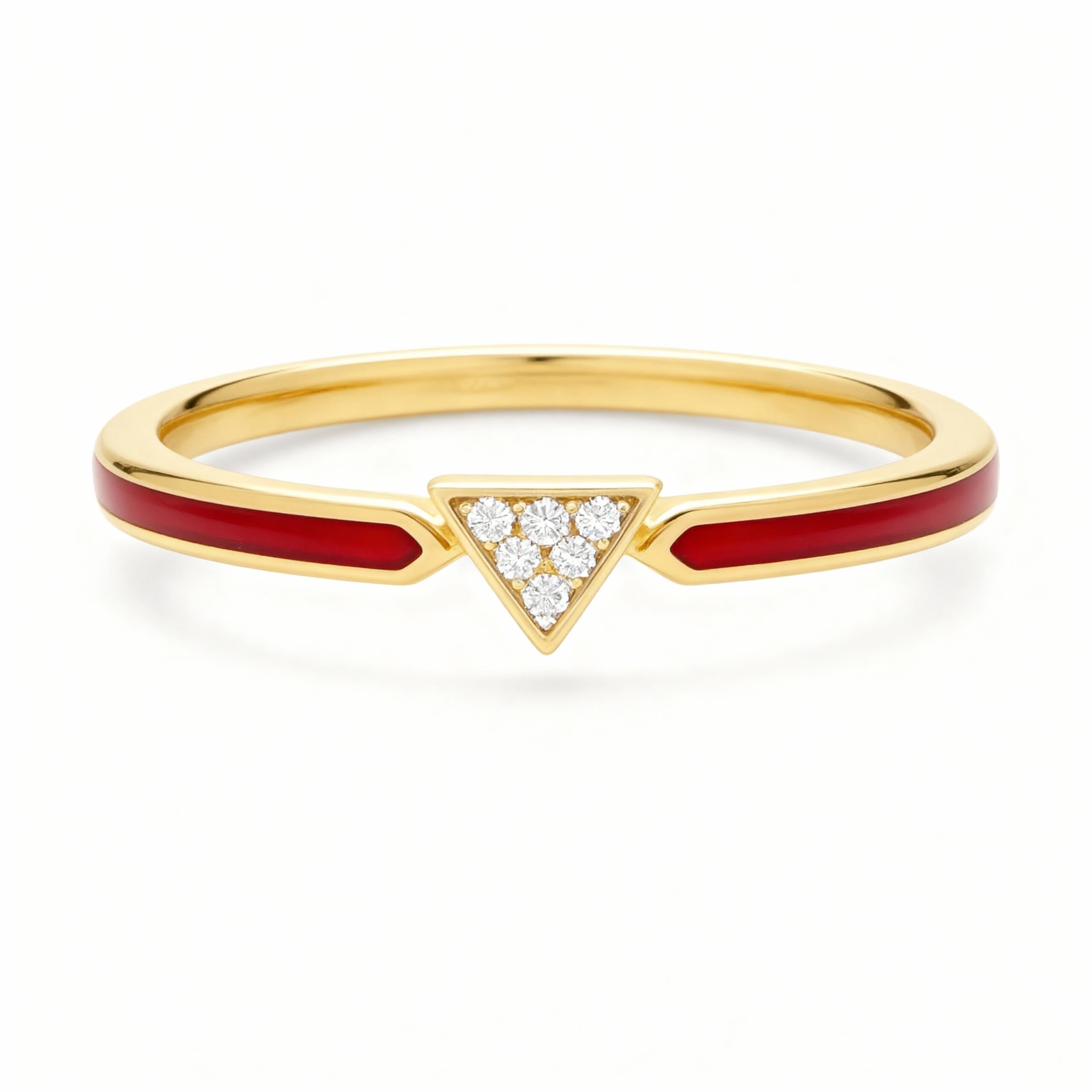 シャープなトライアングルデザインにルビーレッドのエナメルが映える、気品と個性を兼ね備えたリング。