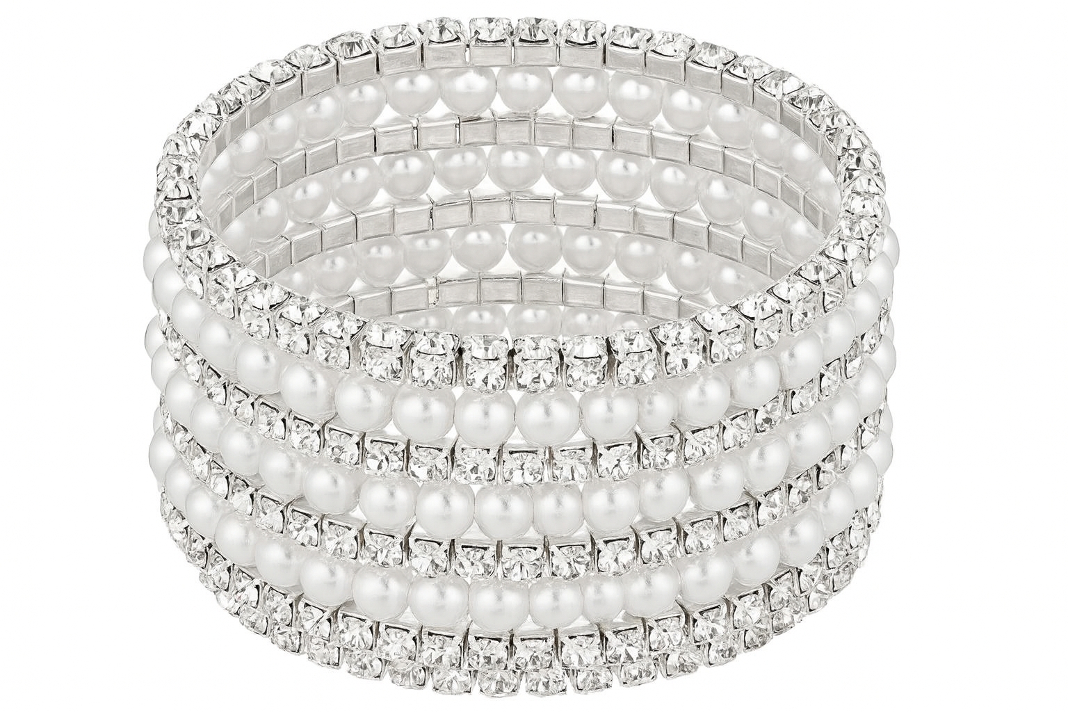 上品な艶を放つホワイトパールと、眩い輝きを放つクリスタルを交互にあしらった5連デザインのラグジュアリーバングル。