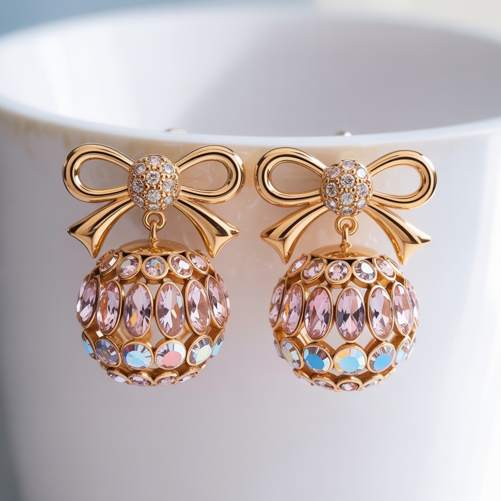 立体的なゴールドリボンの下には、ピンクとオーロラに煌めくクリスタルが贅沢にあしらわれた球体が揺れ、動くたびに多彩な光を放ちます。